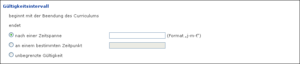 Hier wird festgelegt, wann das Curriculum bearbeitet werden darf. Für Zeitspannen wird immer das Format „Jahr-Monat-Tag“ (z.B. 0-6-0 für 6 Monate) erwartet. Bestimmte Zeitpunkte werde in folgendem Format angegeben: tt.MM.jjjj (z.B. 01.12.2009). Diese Formate gelten auch für alle weiteren Zeitpunkte und Zeitspannen.